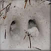 横からガサガサと音がして、遊歩道のすぐ脇にエゾライチョウが! 黙々と地面をつついて いました。お腹が黄色いずんぐりした鳥、アオジでしょうか。残雪の上の足跡。動物の足跡を雪の上に見る事ができるのもあと少しです。 |