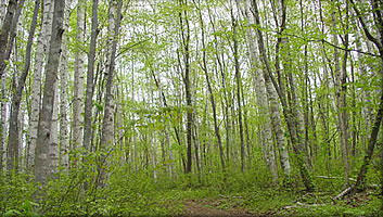 | 木々が次々と芽吹き始めています!木の種類によってそれぞれ色が違い、やわらかくみずみずしい若葉たちが別世界を創っています。一年でこの季節だけ見ることができる、感動的な森の姿です。 |