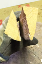 焚きつけの割り方にコツが一つあります。木口が四角ではなく、三角形になるように割る、ということです。木口が四角くなった小割は、もう一回、対角線に割ると三角になりますね。こうすると薄い角ができ、とても着火しやすくなるのです。