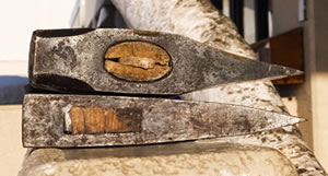 ナタは鋭いけれど軽いので、太い薪は割るのに苦労します。手斧が向いています。薪の木口(こぐち=切断面)に手斧の下端を少し食い込ませ、トンと薪ごと振り下ろすと狙った場所が割れます。