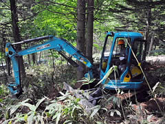 施工方法は実習してもらうしかないのですが、作業は「路線を考えながら通り道の木やササを切る先行伐倒手」と「バックホー(ユンボ)のオペレータ」の二人一組が基本です。